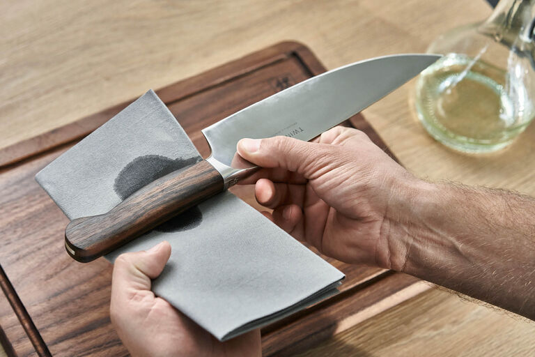 The most important aspect when it comes to looking after your knife is how you clean it: to prevent aggressive cleaning agents from causing premature wear and tear to your knife, we recommend cleaning it by hand using lukewarm water, mild dish soap and a non-scratch cloth or sponge. Knives made from our own special formula steel are actually dishwasher-safe, but only at temperatures of 55 °C and lower.