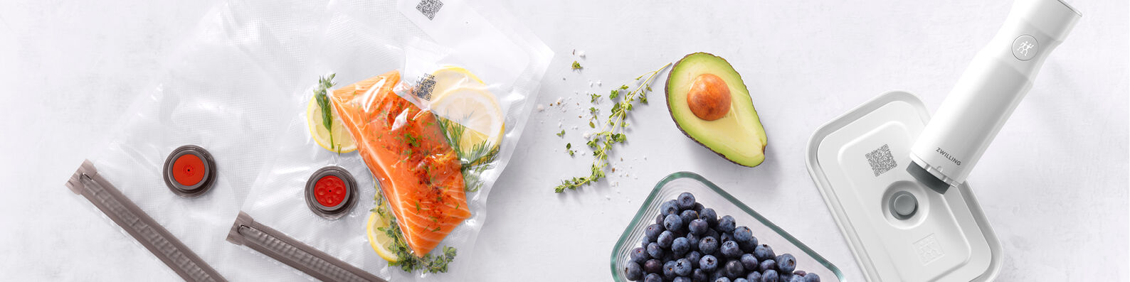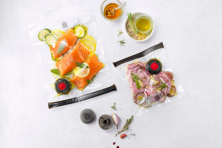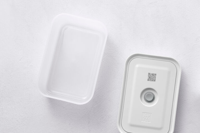 One way of storing your ingredients and dishes is in the ZWILLING FRESH & SAVE vacuum seal bags. They are made from BPA-free plastic and are reusable. And they offer versatility and ease every time: Simply Fill, seal with the practical zipper and then suck the air out – thanks to our liquid barrier, this works for soups and sauces too. The bags are suitable for storing and freezing food and for sous-vide cooking. You can track your food in the Culinary World app using the QR code provided.