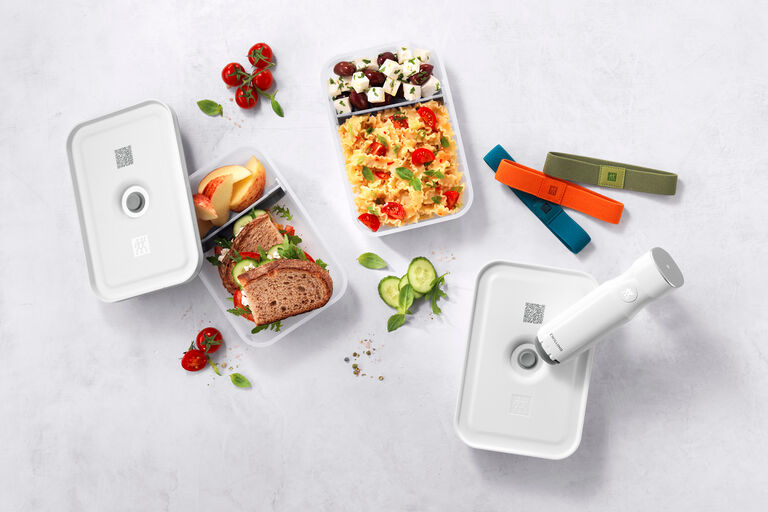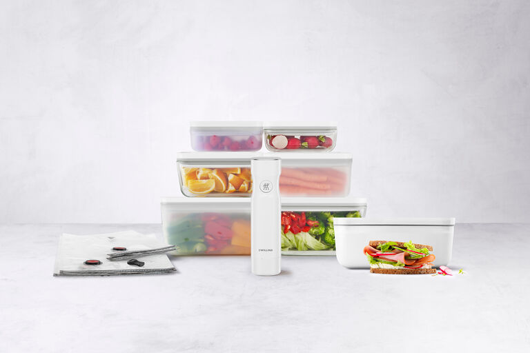 Whatever the bags can do, the ZWILLING FRESH & SAVE containers can too. Our food storage containers come in various sizes and are available in either plastic or borosilicate glass. You can also choose between individual containers or sets of containers in different sizes. Vacuum sealing using the pump works in the same way as with the bags. The containers are an ideal way of storing food properly and taking your kitchen organization to a whole new lewel.
